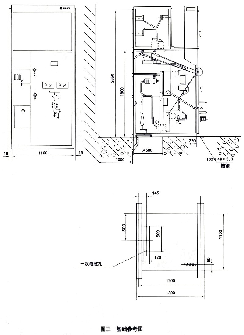 本开关柜为金属封闭箱型结构,柜体骨架由角钢焊接而成,柜内用钢板分隔成断路器室、母线室、电缆室、继电器室,并可通过门面上的观察窗和照明灯观察柜内各主要元件的运行情况。为提高开关柜的技术性能,各主要元件进行了重新设计(如断路器、旋转式隔离开关等)。根据柜体布置,继电器室可安装继电器,门上可装设信号继电器、指示仪表、信号灯,转换开关安装与操作小室。后部为母线室。下部为电缆室,用户可方便地进行接线。前面为断路器室,方便了开关柜的检修。柜体的内部机构参见图一、图二和产品说明书。